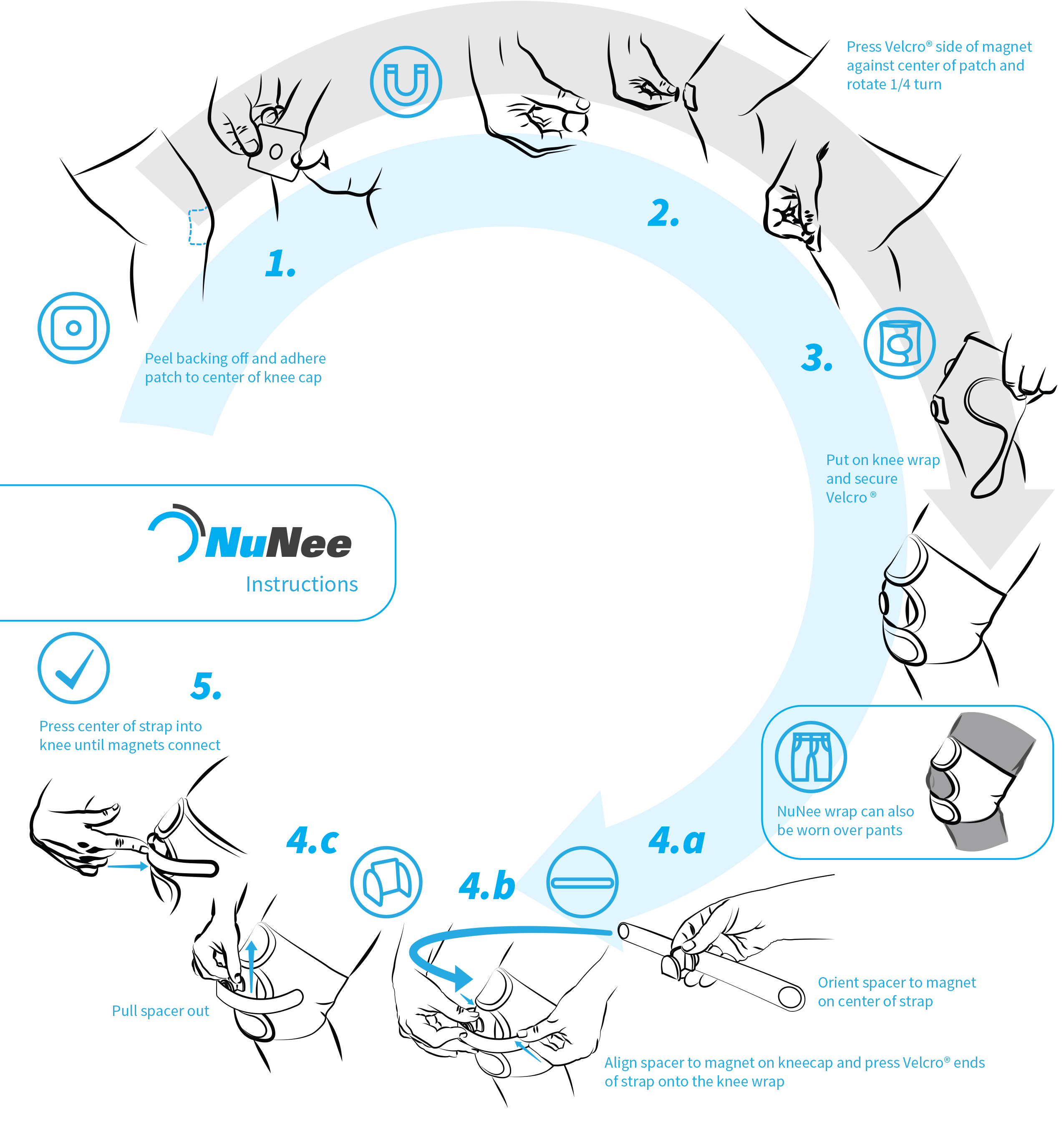 You should here a "click" as the magnet on your patella engages with the magnet on the NuNee Strap.